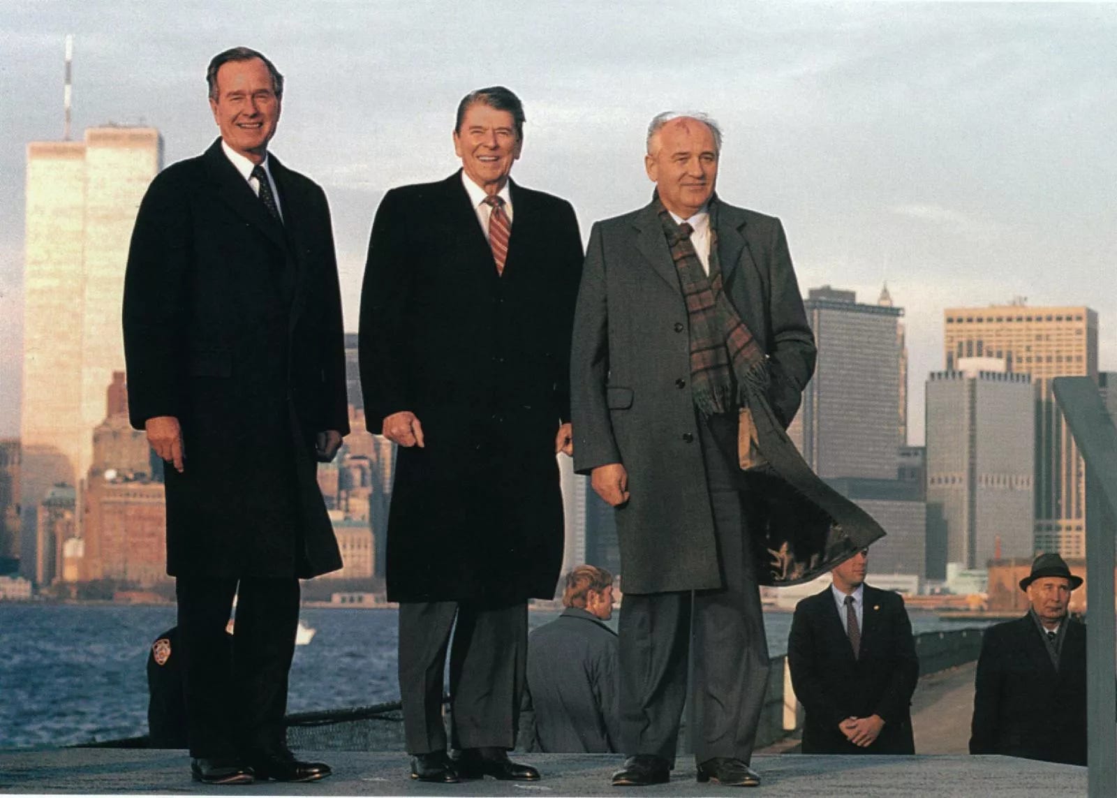 - Встреча в Нью-Йорке в декабре 1988 года. Легендарная фотосессия на троих: Рейган, Горбачев и Буш-старший на фоне сияющих башен Всемирного торгового центра.