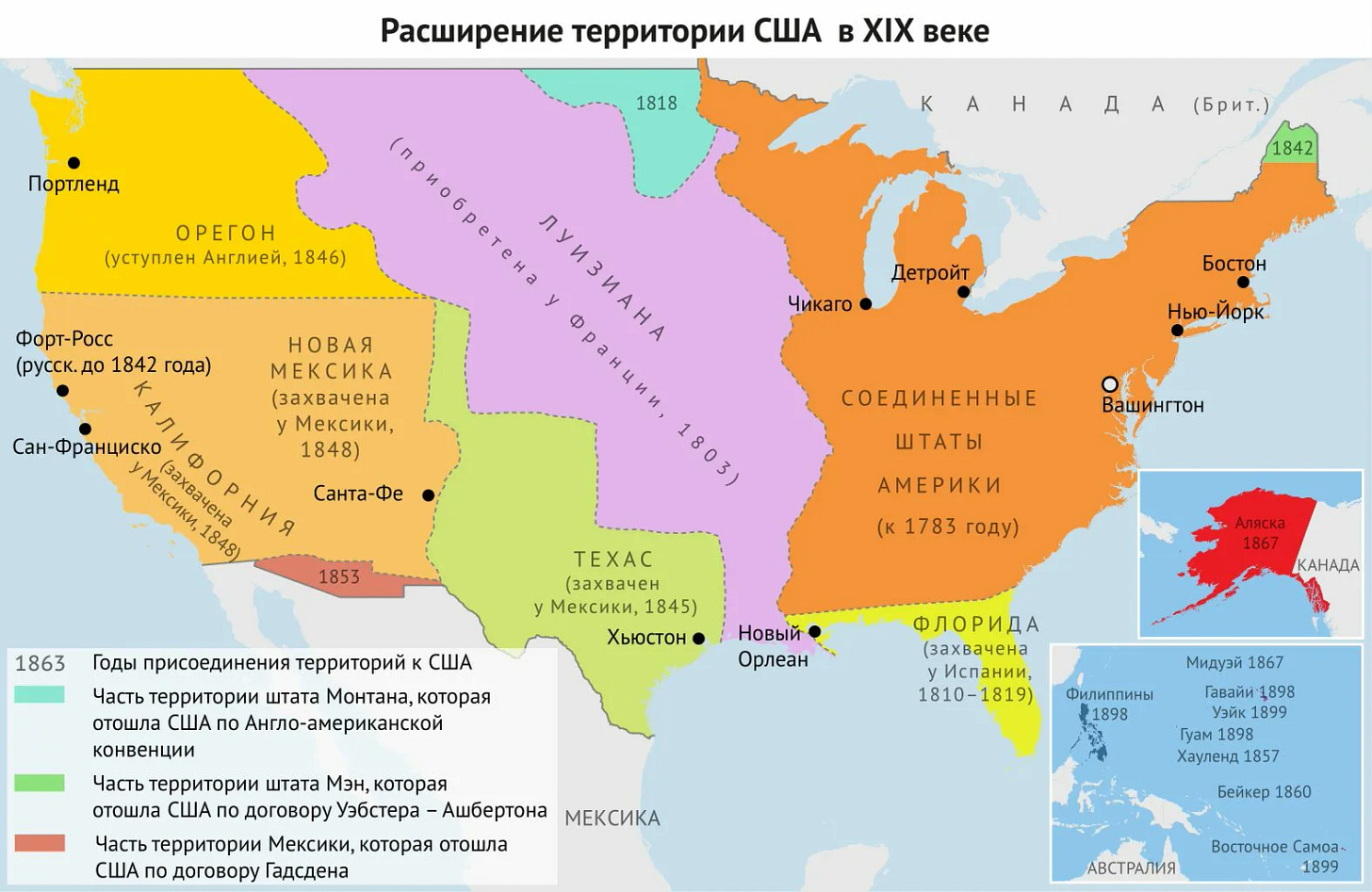 Уже в 1803 году Тринадцать колоний приросли гигантской Французской Луизианой, купленной у Наполеона за 15 миллионов долларов; в 1818 году они получили от британцев Орегон и значительные территории вдоль побережья Тихого океана; в 1819 году — испанскую Флориду; в 1845 году был аннексирован Техас; в 1846-48 года, по итогам американо-мексиканской войны, Штатам достались Нью-Мексико и северная Калифорния; в 1867 году Аляска и другие земли Русской Амеркии были куплены за 7,2 миллиона долларов у императора Александа II.