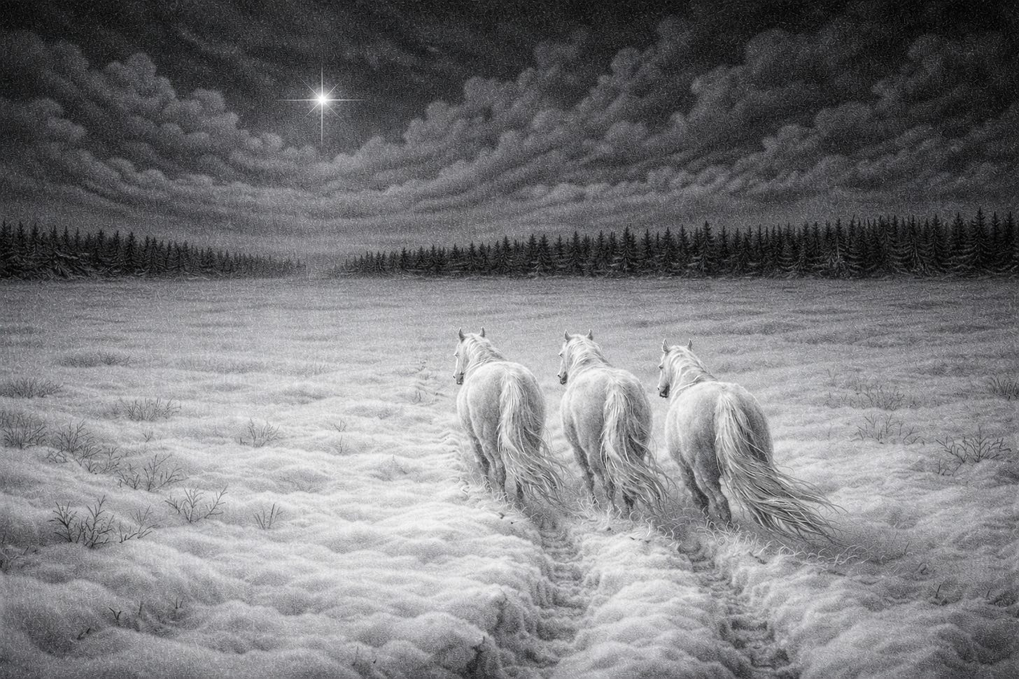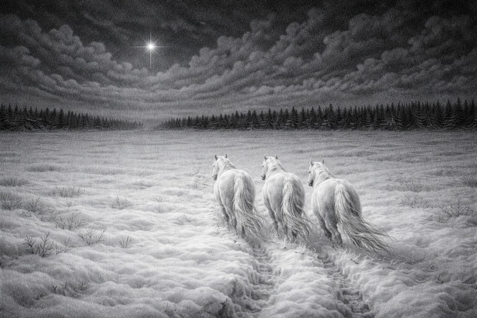 По полю, в направлении леса, вышагивали три кобылицы без седоков — на дороге им было бы легче, но они сторонились торного пути, чуя человека. Лошади фыркали, обдавая друг друга клубами морозного пара. Посеребренные гривы ниспадали до земли, жилистые ноги утопали в сугробах. Идущая впереди кобылица напоминала варяжскую ладью, рассекающую полночное море своей изящно выгнутой молочной шеей.