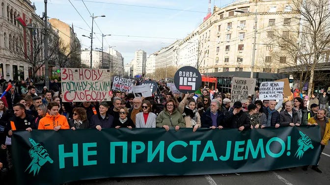 В России подобные катастрофы на инфраструктуре случаются регулярно, но для маленькой Сербии это стало шоком. Массовые уличные акции начались почти сразу — в первые дни они имели траурный характер, однако достаточно быстро движение перекинулось на Белград и обрело четкий политический окрас.